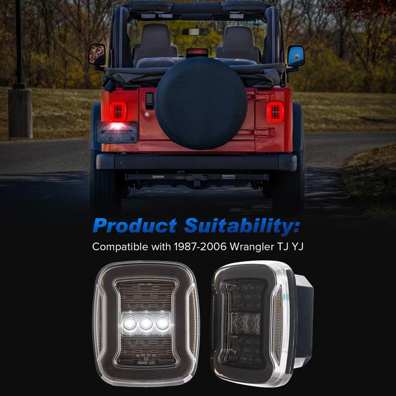 • 【Fitment】HTZCMOTO LED tail light assembly compatible with 1987-1995 Wrangler YJ, 1997-2006 Wrangler TJ. NOTE: Wrangler TJ must be fitted with our EP26 LED flashing relay for the turn signal to work better and properly.