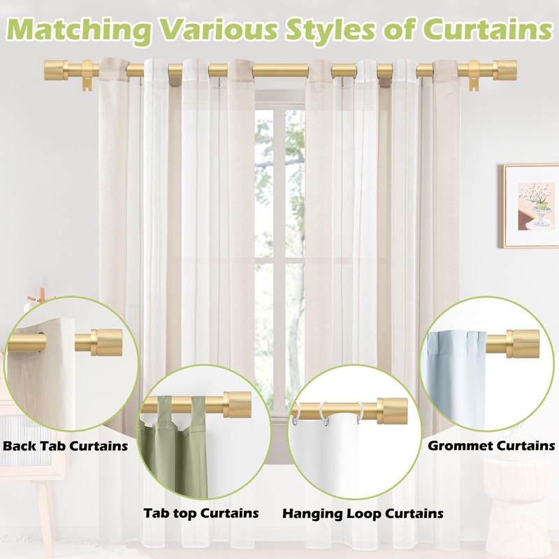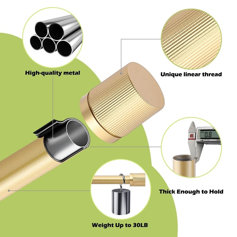 - Modern Design, Superb CraftsmanshipHTZON 2 Pack window curtain rods craftsmanship, modern minimalist style cylinder finial, cylinder surface engraved with unique vertical stripes, both versatile and artistic, whether it's a modern style, lightweight luxury style or minimalist style, it can be effortlessly blended with it. At the same time, his use of the scene is very wide,Gold curtain rods for windows can be installed in the space of the bedroom, living room, kitchen, bathroom and so on.