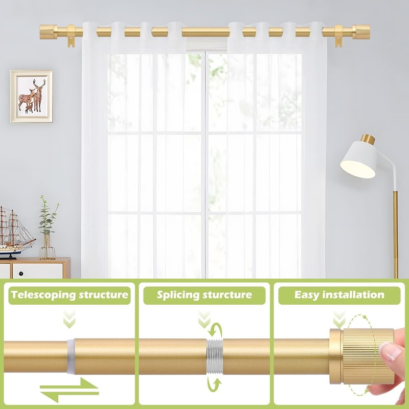 - PACKAGE INCLUDESHTZON 36 to 88 2 Pack adjustable curtain rod :Brass gold drapery rods include 16" rod * 12 (7/8" telescopic rod * 4, 1" fixed rod * 8) brackets * 6, screws * 12 and anchors * 12,connector * 6,finials * 4. Please check all the accessories in the window single rods package first, if any of the accessories are missing, please be sure to contact us at the first time, we will reply your email and solve the problem as soon as possible.