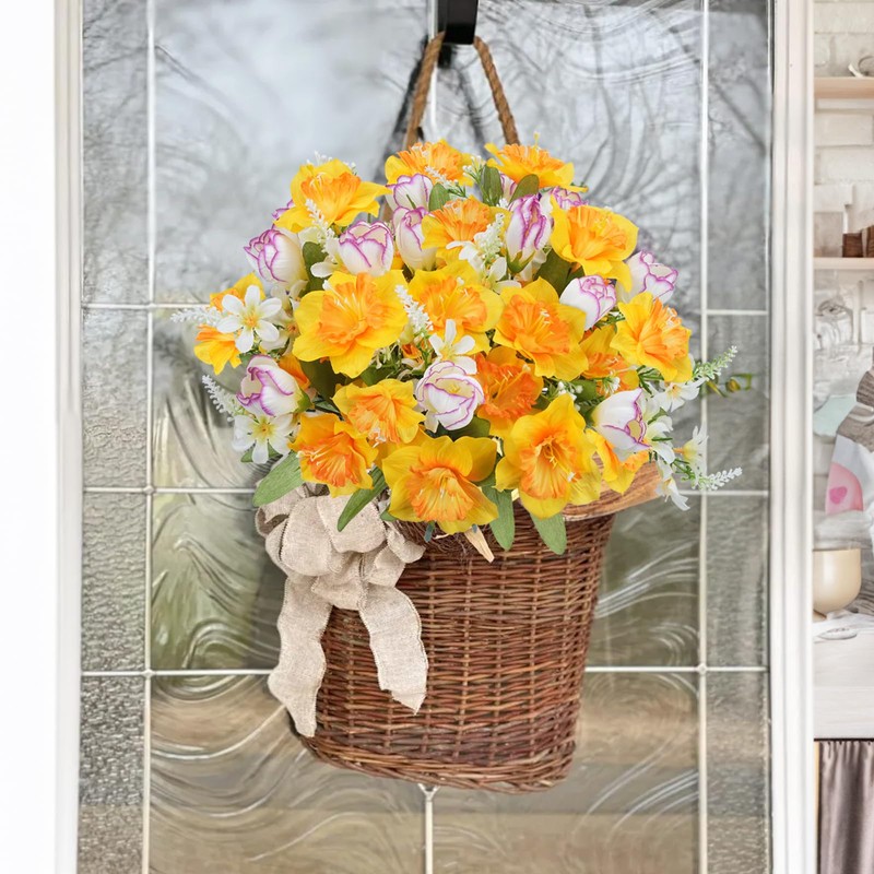 - This faux flower bouquet features match with yellow daffodil silk Lavender flowers, and some green eucalyptus leaves. Rose, peony, lavenders, daffodils, etc. You will get a super spring pop colors on this fake flowers. Lifelike silk floral arrangements are ideal for spring faux flowers home decor in a vase, also it is great for cemetery flowers outdoor