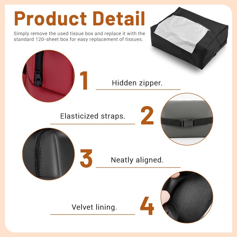 Einfach und zart: Diese Auto-Tücherorganisation hat einen Reißverschluss an der Seite, der glatt ist und sich nicht verhakt, so dass es einfach für Sie ist, die Box mit Taschentüchern zu füllen. Seine Lederstruktur passt auch zu Ihrem Autoinnenraum.
