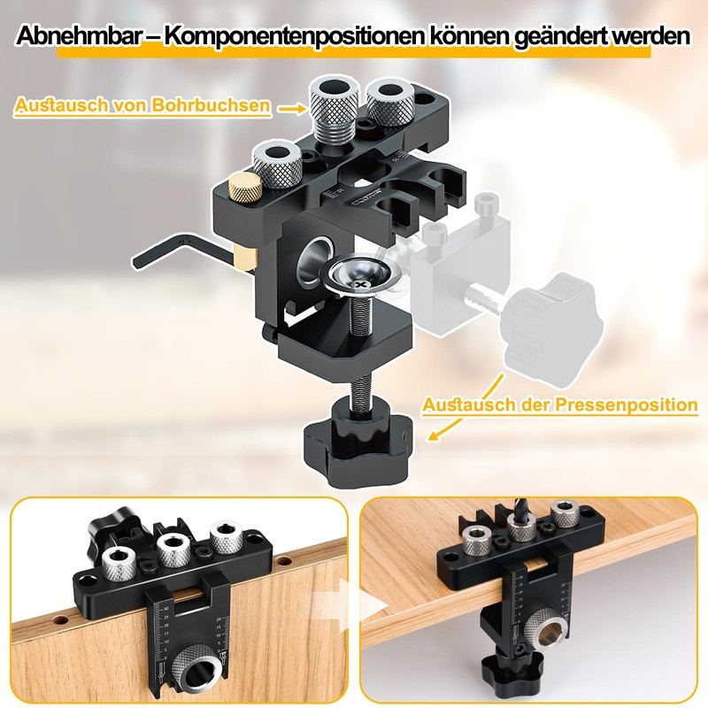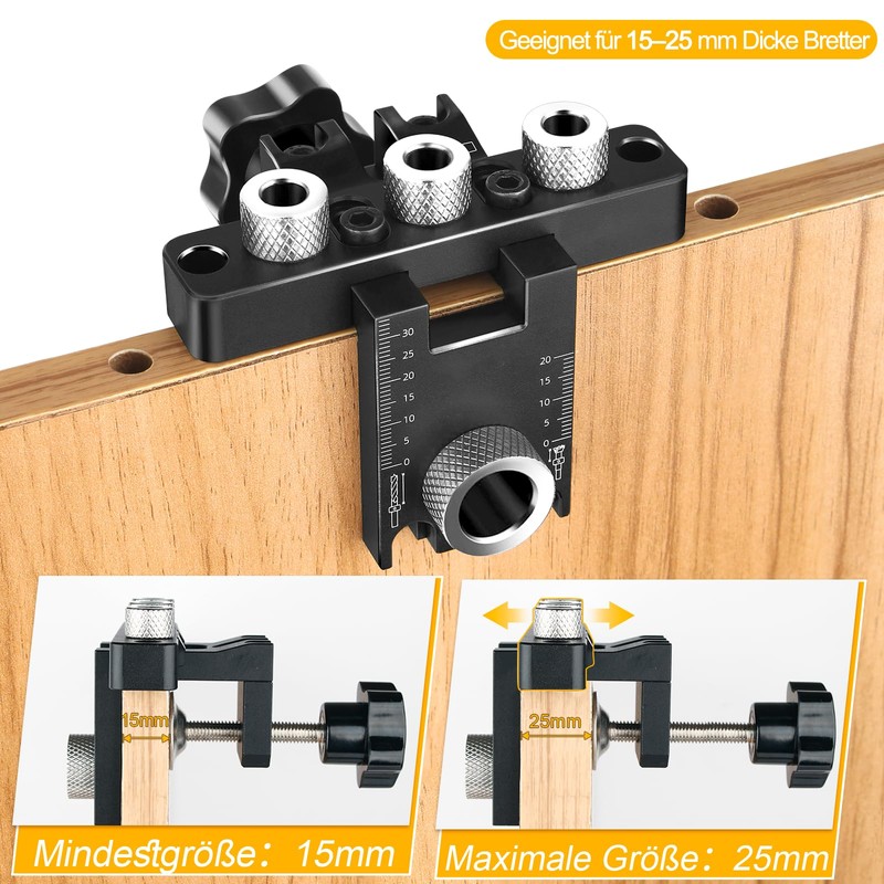 - Multifunctional dowel gauge: pocket hole gig is equipped with 8 mm, 10 mm and 15 mm drills. The 3-in-1 hole punch can meet your requirements for different hole sizes. It can be used for precise positioning of holes and vertical punching. The height and depth of the hole are adjustable and suitable for boards with a thickness of 15-25 mm. The complete set meets your different drilling requirements
