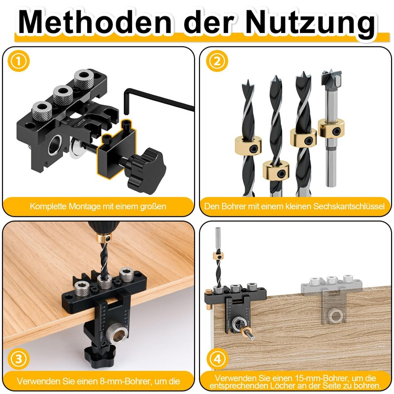 - Packing list: dowel drill template set includes 1 x 3-in-1 drill guide (requires easy installation), 4 x drill bits (2 x 8 mm, 1 x 10 mm, 1 x 15 mm), 1 x 10 mm drill sleeve, 1 x brass stop block, 3 x wooden dowels, 2 x hex keys. It is specially designed for drill and board joints, making it an ideal tool for panel furniture