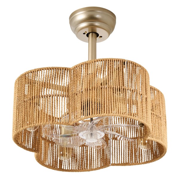 hualuosi 18.9in Rattan Ceiling Fans, Boho Kitchen Ceiling Fan with Light Caged Fandelier with Lights and Remote Rustic Woven Paper Rope Ceiling Fans 6 Speeds for Bedroom Nursery Living Room, E26 Base