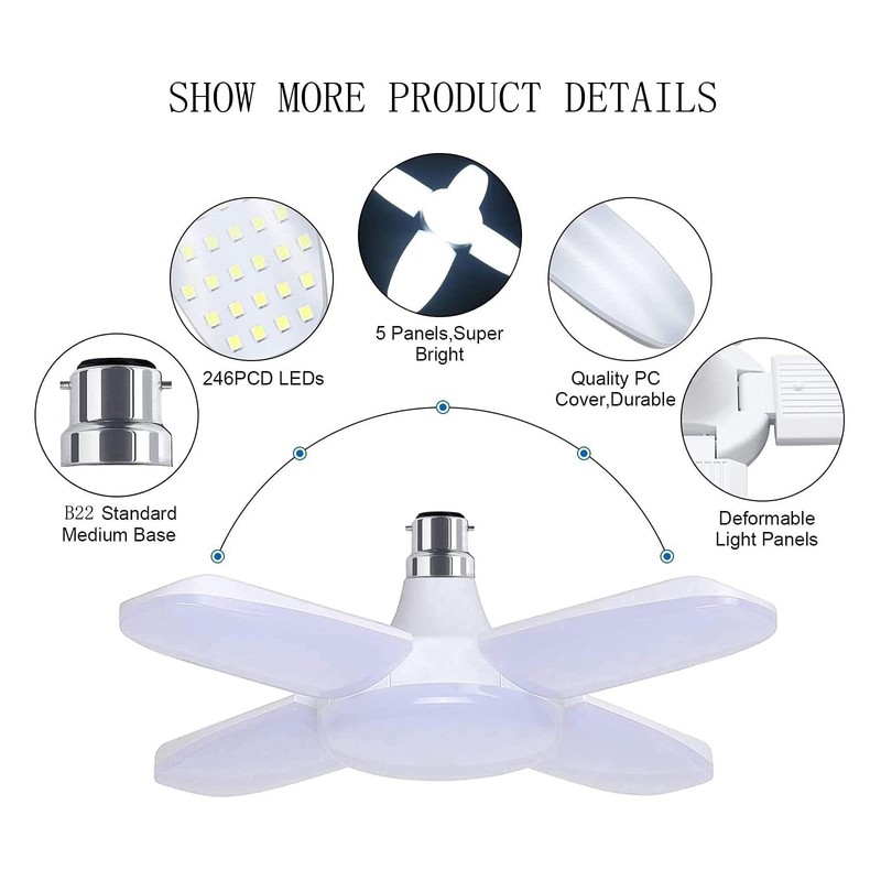 - 💡Super Bright Adjustable Design : LED Garage light provides a 6000 lumen output in 6500K Cool White. There is 1 circular LED lamp and 4 bright LED panels with upward wide angle adjustable design, for cover a wider area.