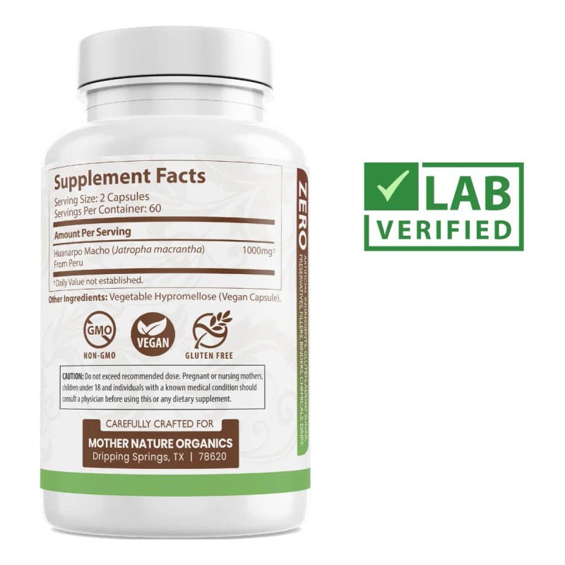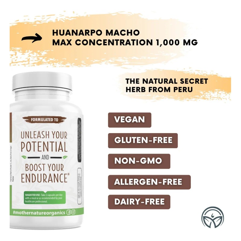 Suplemento natural de Huanarpo Macho originario del Perú para mejorar rendimiento y energía masculina.Fórmula potente de 1000mg y 120 cápsulas.Sin gluten, lácteos, y apto para veganos.Apoya fuerza, stamina y rendimiento óptimo para hombres activos.