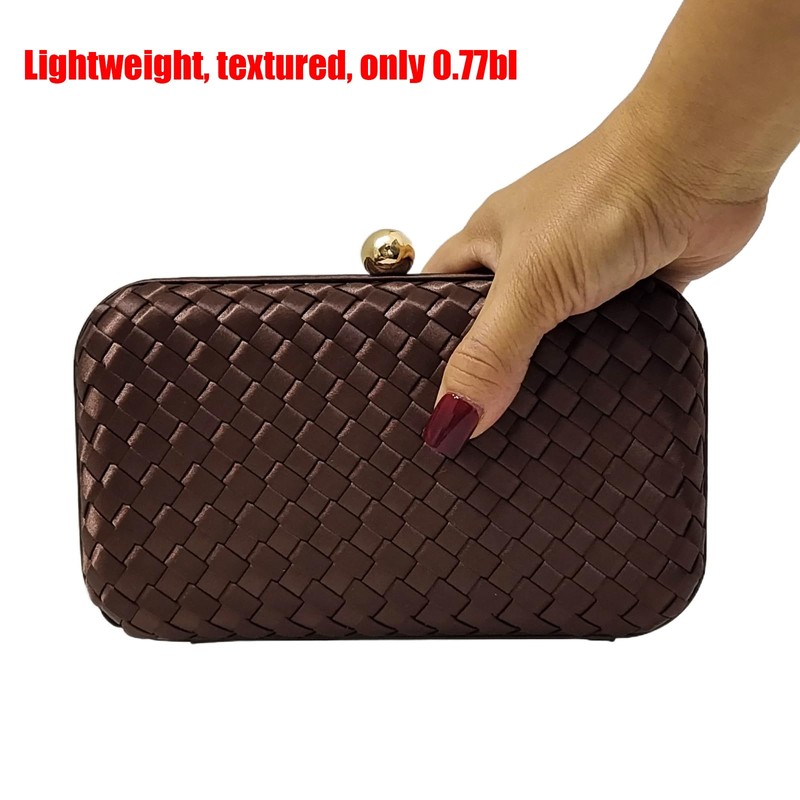 - ❀❀Size & Capacity.❀❀ Color: coffee. Dimensions: L7.48 x H4.33 x W1.96 inches, about 19 x 11 x 5cm. This women's woven evening bag can hold your cellphone, lipstick, keys, foundation case, tissues, other small things.It's lightweight at 0.77 lbs, can be held directly by hand effortless.