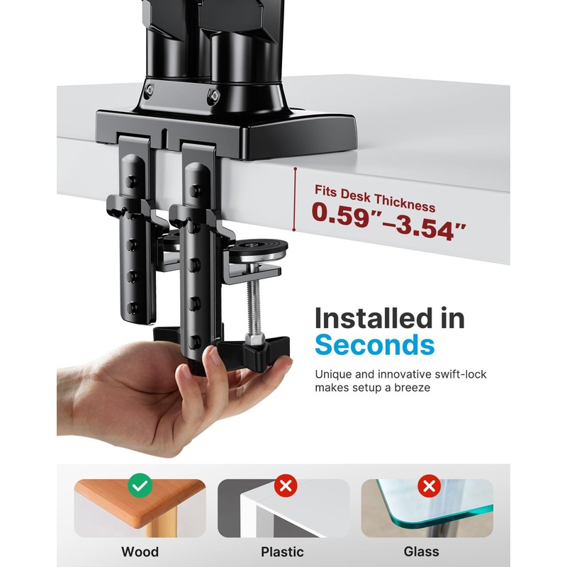 - Regarding the compatibility with desks, your desk must meet three conditions at the same time: First, desk material: Only wooden desks are recommended, plastic or glass desks cannot be used. Second, desk thickness range: 0.59" - 3.54". Third, the bottom of the desk should not have any cross beams or panels, as this will interfere with installation. We recommend carefully checking that your desk and monitors meets all above conditions before purchasing.