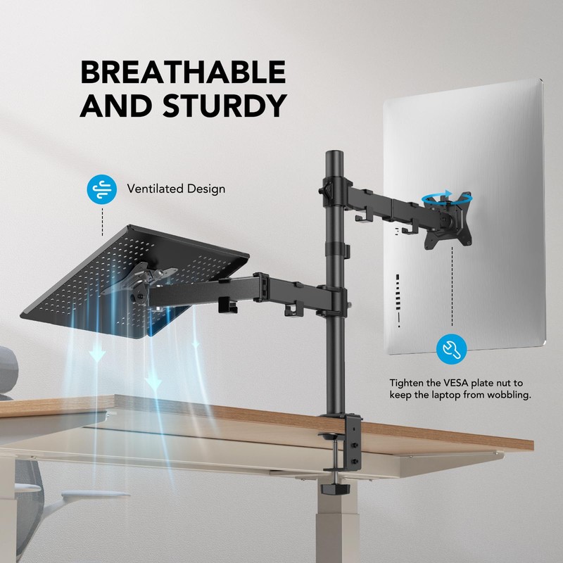 • Laptop Mount Compatibility: This Laptop stand is designed with 15” x 17” ventilated tray and a 0.8” protruding bottom lip. Laptop tray with a breathable design to help avoid overheating. The single laptop arm can extend up to 16''.