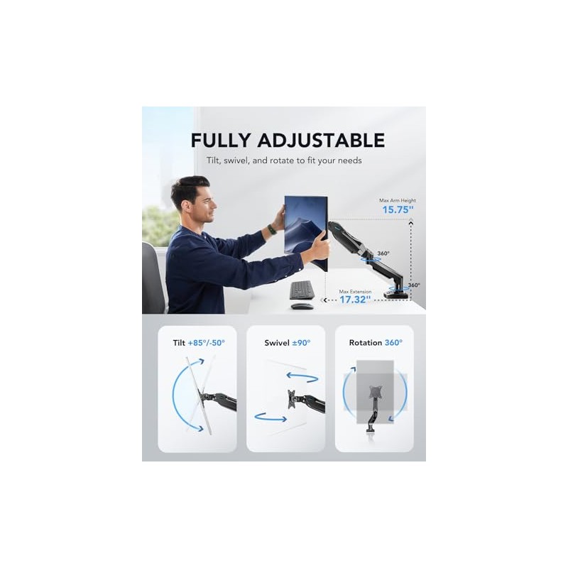 - Full Adjustable: This PC monitor stand can remain completely stable at any angle without any extra work. Compared with other single monitor arm adjustment methods, huanuo can make you adjust screws repeatedly, this monitor arm is easy to use and has a tilt range from -50to +85, 90 swivel, and 360rotation, so your screen can be lifted up to 39.6cm from desktop with one hand.