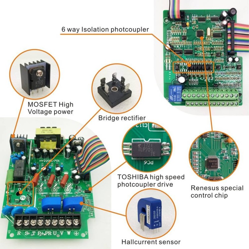 - 【Safety performance】Take advantage of various protection ways such as Motor short-circuit detection at power-on, output phase loss protection, over-current protection, over-voltage protection, under-voltage protection, overheat protection, overload protection and etc.