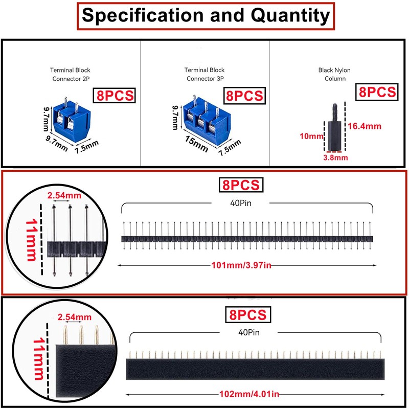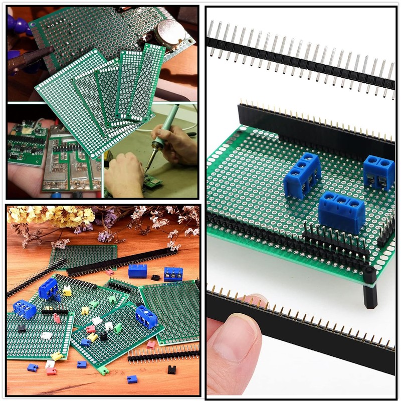 - The package includes: 16 pieces double-sided PCB universal board (2 x 8 cm, 6 x 4 cm, 3 x 7 cm, 5 x 7 cm prototype PCB universal board), 16 pieces screw terminal (6 pieces 2 pin + 6 pieces 3 pin), 16 pieces header of the circuit board + 20 tablets nylon column hex bolts.