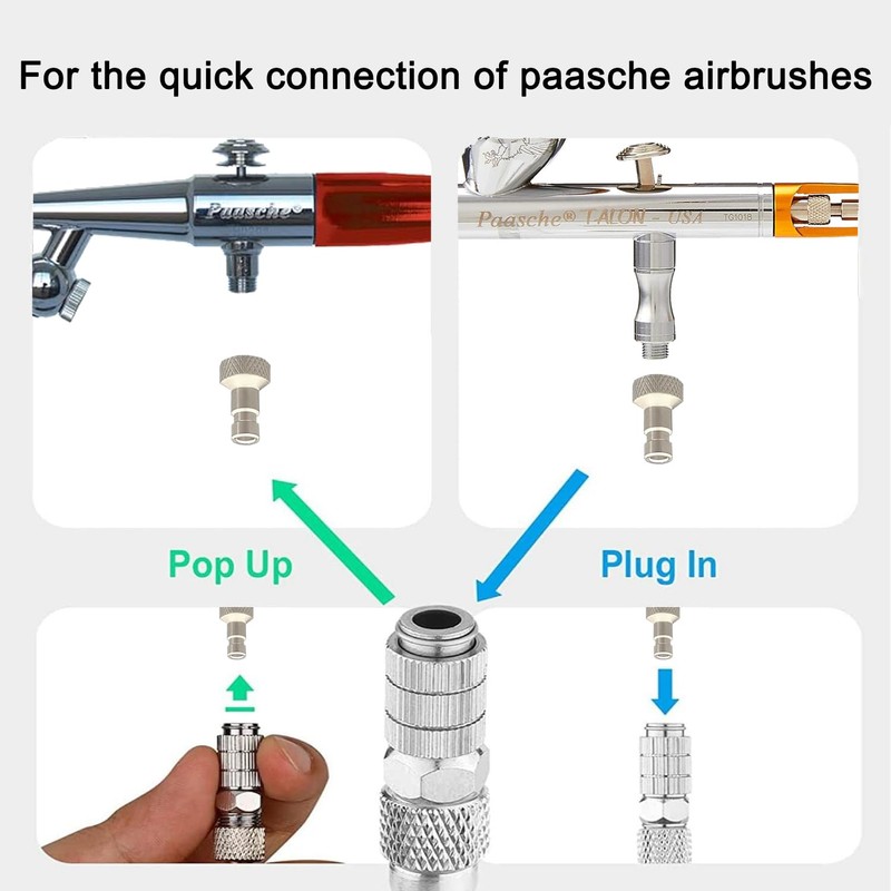 - 2.Easy to connect and disconnect airbrush kit without screw trouble. Change several airbrush guns quickly and easily when you use multiple airbrushes with singe airbrush hose.