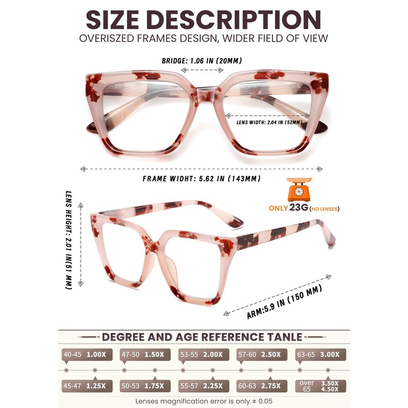 - Flexible Spring Hinge for Comfortable Wear: Our glasses feature a flexible spring hinge adjustable design that is lightweight and can be opened outward 145 °. This design helps reduce uncomfortable pinching and stress, making them suitable for different face shapes.