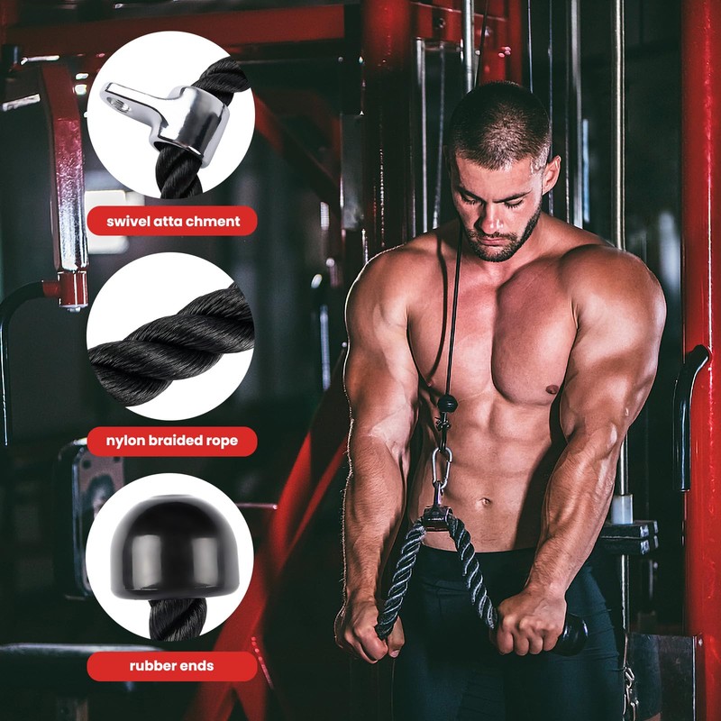 - The pulley system gym is enhanced with a dedicated hook position where additional training equipment, like a triceps rope, can be easily hung. This feature offers convenience and space-saving benefits by allowing you to conveniently store and use other equipment alongside the pulley system.