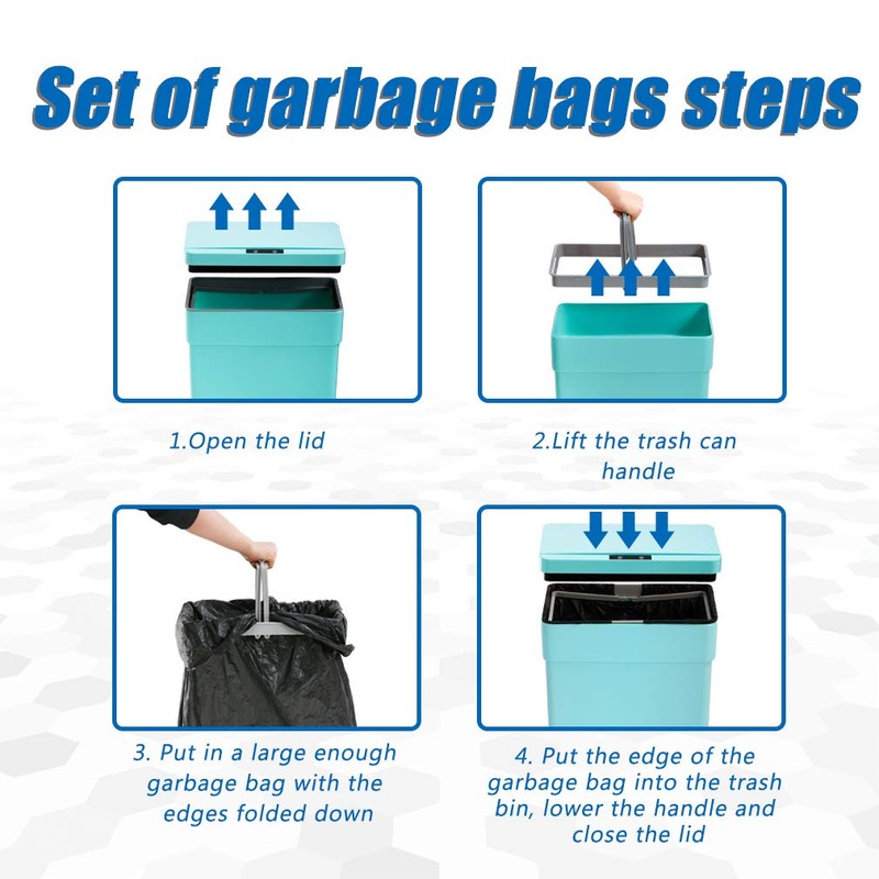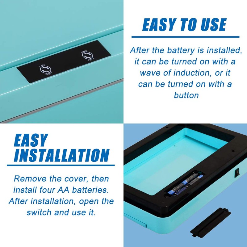 LARGE CAPACITY SMART TRASH The large capacity of 13 gallon can meet daily needs. Our trash can needs 2 AA batteries and there is a power switch on the back of the lid. When you don’t use it for a long time you can turn off the power. It can be used anywhere in the home and of course it can be placed in your office. Let the smart trash can provide more convenience to your life, you will like it very much. Features: - Large capacity: 13 gallons for daily needs - Sturdy PP material: Waterproof and rust-proof easy to clean - Sensing technology: Infrared sensor device, can release free your hands - Odorless: The trash can has good airtightness which can isolate the odor emitted by the trash in the trash. - Easy to assemble: Trash can lid is easy to remove convenient for trash bag placement and removal Specification: - Material: PP solid material - Size: 15.3 (L) * 9.8 (W) * 23.6 (H) inch - Weight: 6.28 pounds - Color: Blue