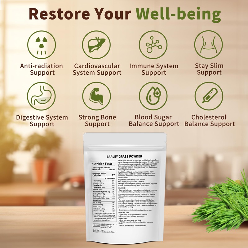 • Easily Absorbed by the Body: Barley Grass Powder contains a variety of nutrients, such as chlorophyll, carotene, amino acids, vitamins, minerals and fiber, which are easily absorbed by the body.