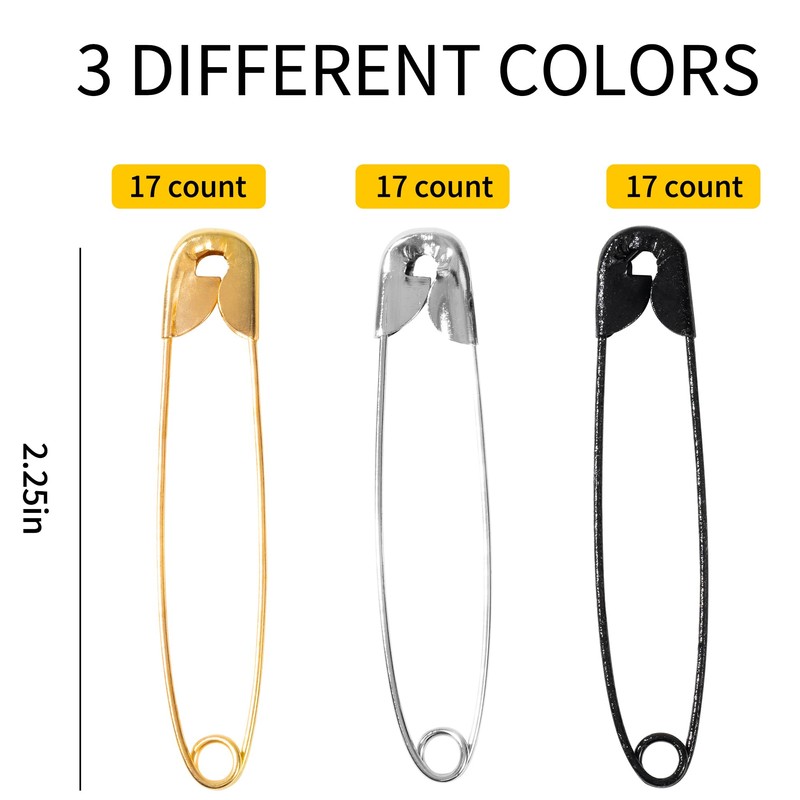 - Various Colors: The Large safety pins kit includes 50pcs silver and black and gold safety pins. The sizes of the Large safety pins is 2.25"(56mm) , Satisfy your daily use.