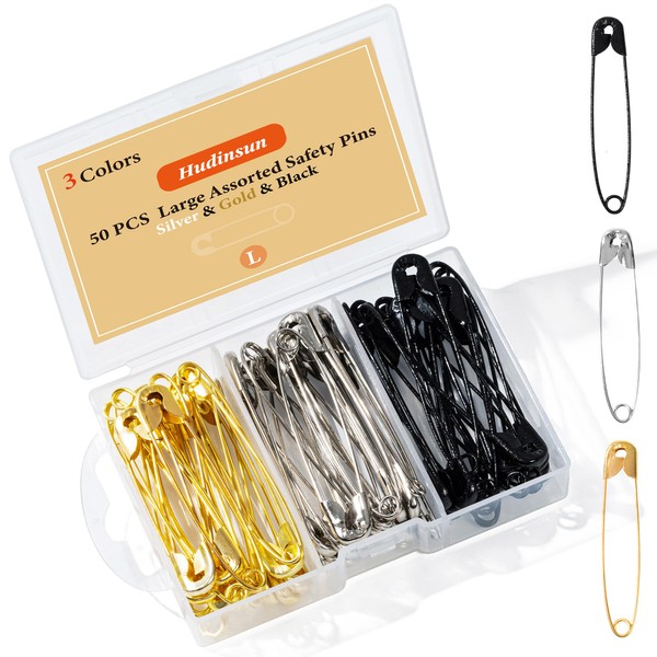 Hudinsun 50 PCS Large Safety Pins Assorted, Silver and Black and Gold Safety Pins Bulk for Sewing and Clothes(56mm)