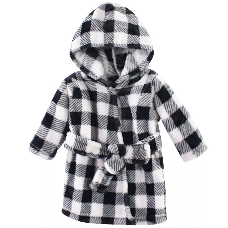 Hudson Baby Infant Plush Animal Face Bathrobe, Black Plaid, 0-9 Months