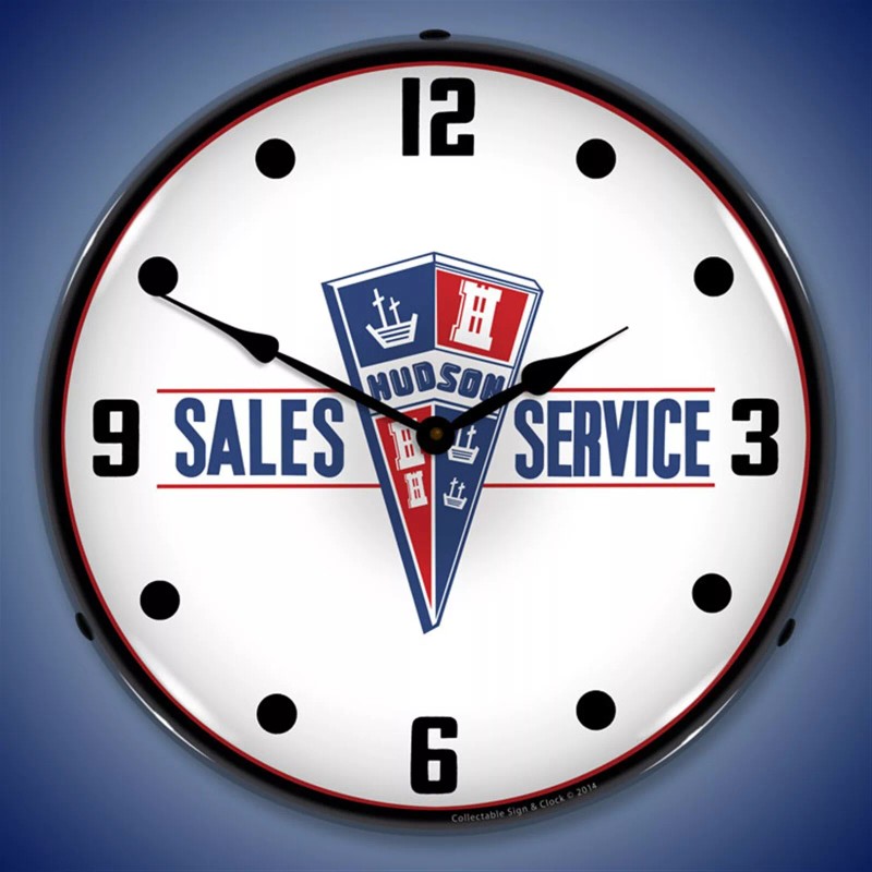 This Hudson Sales and Service Wall Clock, LED Lighted is a 14 inch backlit LED lighted clock manufactured in America. The clock has an antique, vintage look and feel to it..