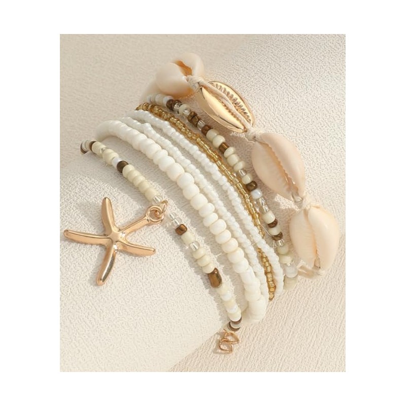 huefeel Boho Beach Anklet Set, 7 Pieces, Shell and Starfish Charms, White and Gold Beaded Bracelets (White Shell)