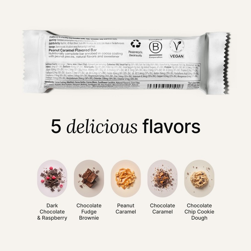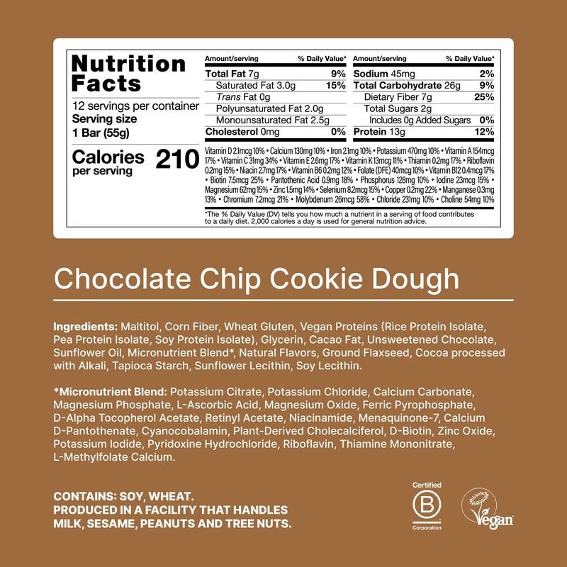 - COMPLETE NUTRITION BARS: A nutritionally complete bar with a cookie dough-flavored base with caramel, high-protein cocoa crisps, and vegan chocolate chips, all wrapped in velvety vegan milk chocolate. High in protein and fiber, with all 27 essential vitamins and minerals, our brand new bars are the perfect snack to satisfy your sweet tooth and fuel your body with quality nutrition.