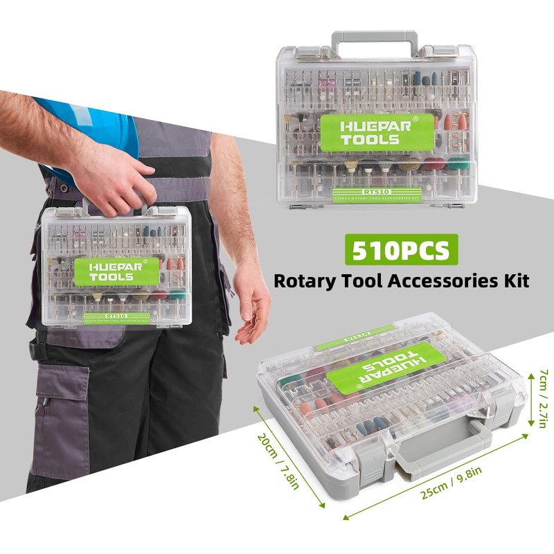 • 【Professional Warranty and After-Sales Service】 While providing professional and cost-effective handmade tool products, Huepar Tools also pays great attention to the customer's shopping experience. About the product any questions, we will reply in a short time and keep the product 2 years free warranty or replacement. Package includes 510Pcs Rotary Tool Accessories Kit, 1 x Storage Box, 1 x Instruction Manual.(Rotary Tool No Include)
