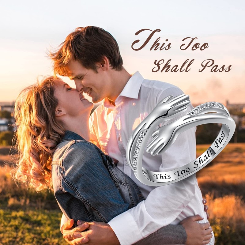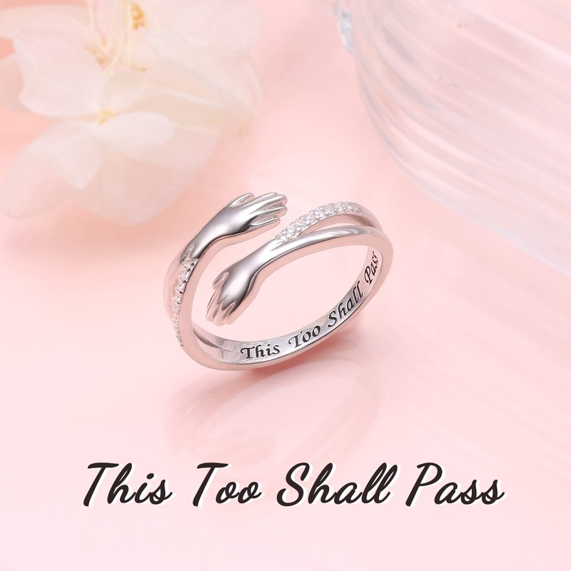 Hug Ring, S925 Sterling Silver Hugging Hands CZ Open Ring Engraved This Too Shall Pass Embrace Statement Promise Anniversary Ring