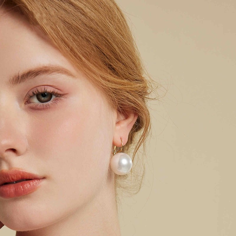 • This pair of Huge tomato big pearl earrings is so attractive thanks to its glossy pearl and its unique clasp design. The mounting has a gold color, which is thin, smart, and detachable