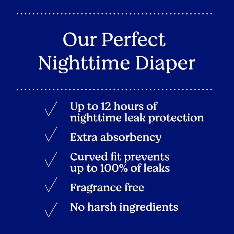 - Nighttime Diapers Designed for Comfort: Contoured shape plus Double Grip Strips deliver a secure fit while a breathable outer cover helps keep your baby’s skin dry and comfortable