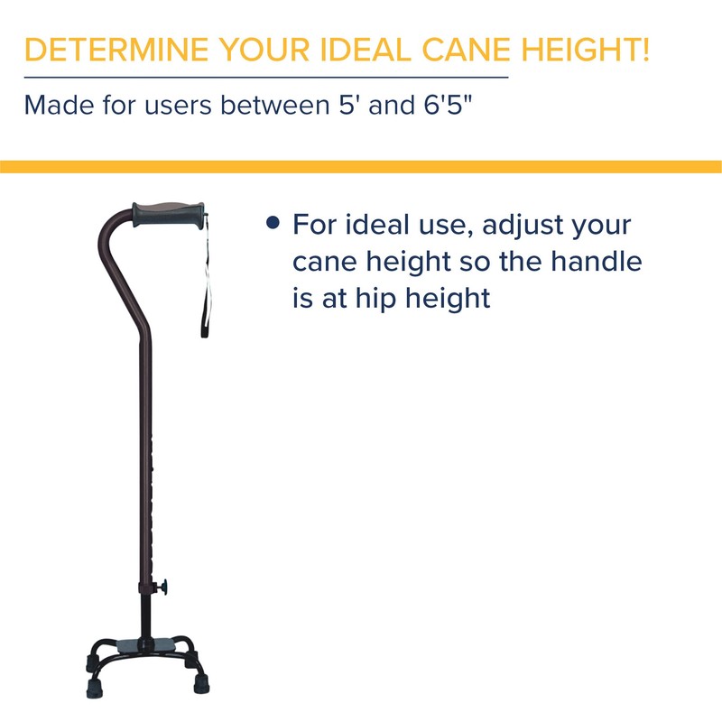 - Adjustable Quad Cane: This large-base, adjustable walking cane for men and women provides ultra-stabilizing support in a lightweight aluminum cane; adjustable walking cane for men and women can accommodate most individuals between 5' and 6'5"; cane is height adjustable from 28 inches to 39 inches
