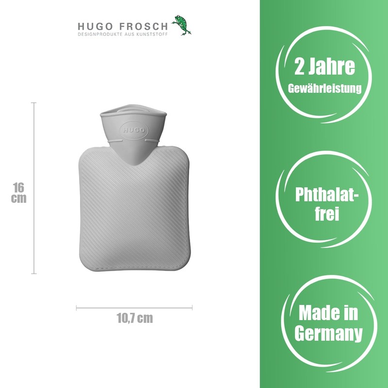 High product quality and production in Germany characterise all Hugo Frosch hot water bottles. Especially for an everyday product that is often used, high-quality materials and high quality standards are particularly important. Uses of these durable and reliable hot water bottles, eco hot water bottles, heat pads and children's hot water bottles are almost unlimited: for abdominal pain, back problems, for better sleep, for comfort, for cuddling or as a gift.