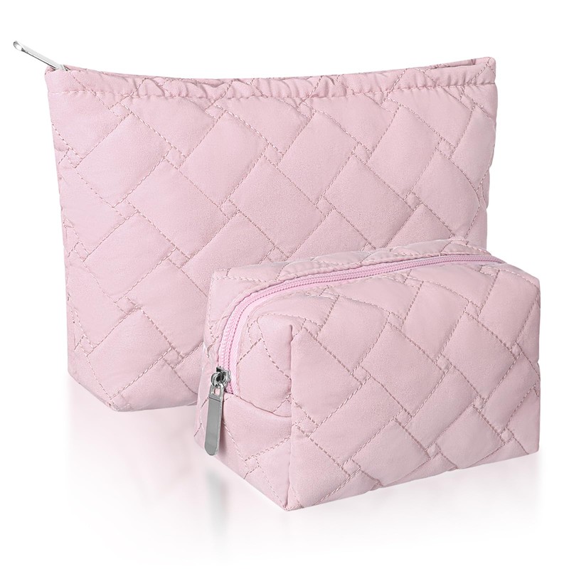 Huhumy 2 Pieces Quilted Makeup Bag for Women Small Quilted Cosmetic Bags Set Aesthetic Travel Toiletry Bag Cute Purse Pouch Pencil Bag Makeup Organizer with Zipper Aesthetic Accessories(Pink)
