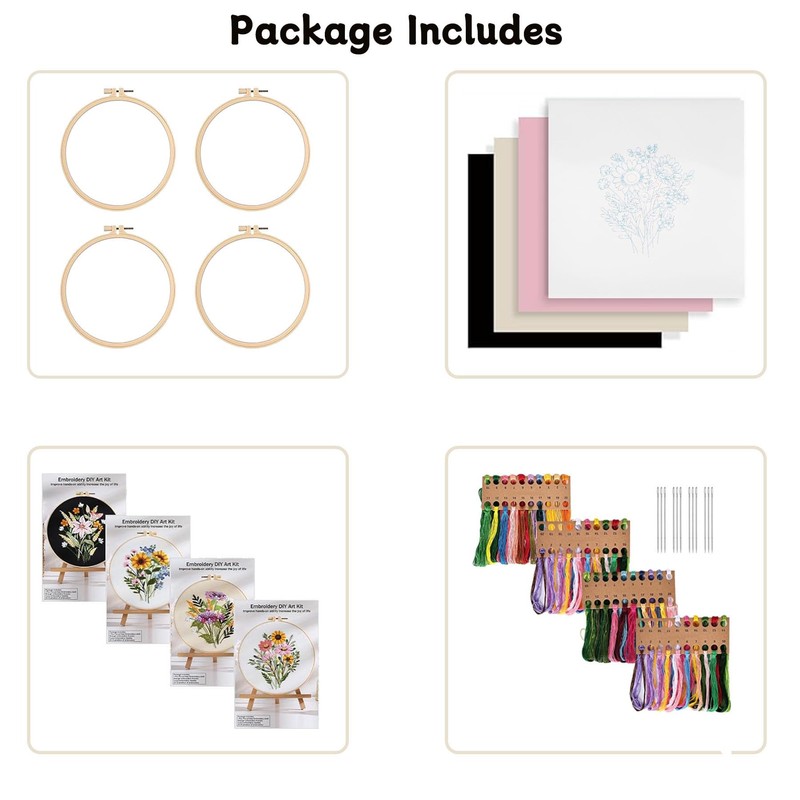 - 🌺4 Pack Embroidery Starter Kits --- The package includes 4 patterns floral embroidery fabrics 11.8x11.8inch (30x30cm), 4 plastic embroidery hoops 7.8 inches (20 cm), 4 packages of soft embroidery floss (enough and extra), 12 needles and English instructions. With these, you can create beautiful embroidery kits of art. Note! the embroidery needles are on the thread cards.