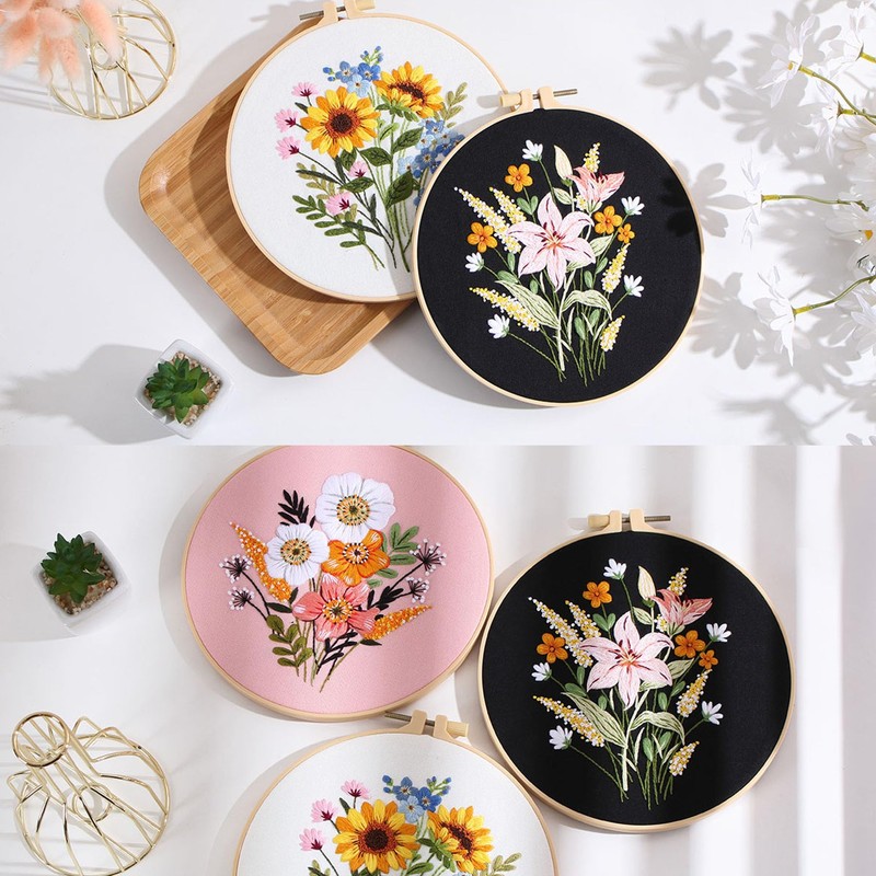 - 🌺Diy Handmade Embroidery Kits for Beginners --- These 4 PCS flowers embroidery sets are made of four different colours of fabric in black, pink, apricot and white with different styles of floral designs, which is richer and more beautiful for the senses, and it is a unique and beautiful set of handmade embroidery crafts.