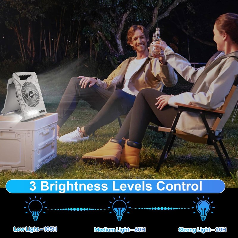 - Dual Light Modes & Brightness Adjustment: The battery fans portable features dual light sources with three adjustable brightness levels, ranging from soft warm white to bright light. With 18-80 hours of battery life, it provides reliable illumination for outdoor activities. The camping fans for tents allow you to long-press the light button to switch to flashlight mode, offering extra lighting for nighttime camping, hiking, or adventures.
