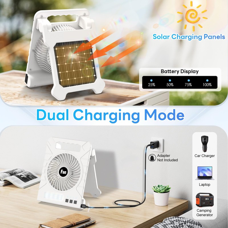 - Dual Charging & Emergency Power: The portable fan rechargeable supports both solar and Type-C charging, ensuring uninterrupted use outdoors. It fully charges via solar power in 8-10 hours under sunlight or in just 6 hours with 5V/2A Type-C fast charging. The solar fans for outside not only provide cooling but also serve as an emergency power bank for phones, tablets, and more. Perfect for outdoor adventures, the camping fans for tents deliver both refreshing airflow and reliable backup power.