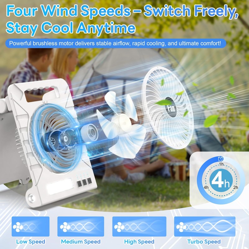 - Timer Function: The battery operated fans come with a 1-4 hour timer function, allowing you to set the fan's runtime based on your needs. Whether you're camping in a tent, resting in the bedroom, or using it as a beach fan, the camping fan rechargeable automatically shuts off after the set time. This feature ensures energy efficiency and quiet operation, letting you sleep peacefully while enjoying a cool and comfortable night.