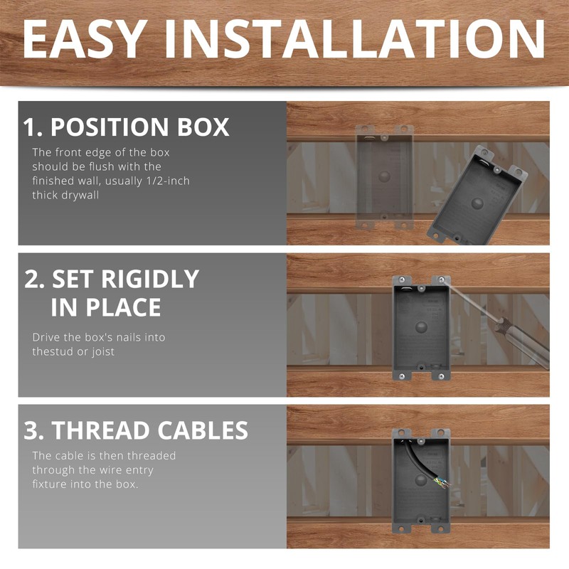 - 【Versatile Design】:Whether you're updating an older home, tackling a remodel, or finishing post-construction wiring, this durable 1-Gang plastic electrical box applicable to multiple scenarios.