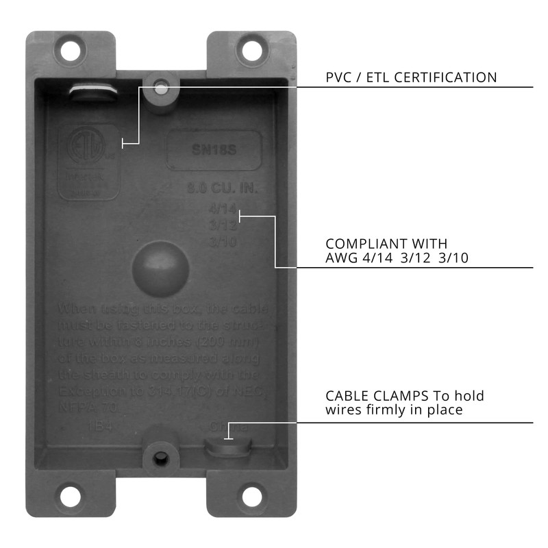 - 【Safety Certified: ETL Listed & Fire-Rated】:ETL-listed electrical outlet junction box. Fire-rated for 2hours single electrical outlet box with AWG 7/14, 6/12, 5/10 US wire standards.