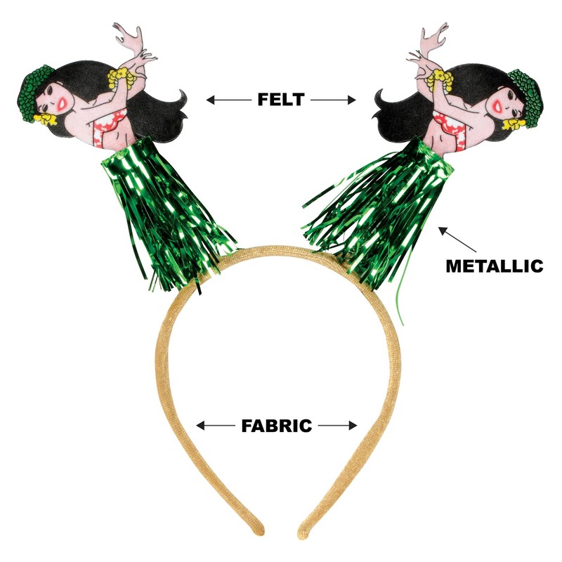 Beistle 60570 Hula Girl Boppers. The hula girls wearing green metallic skirts are attached to a tan fabric covered headband. They are one size fits most. The hula girl boppers will be a fun item to wear at a luau party!.