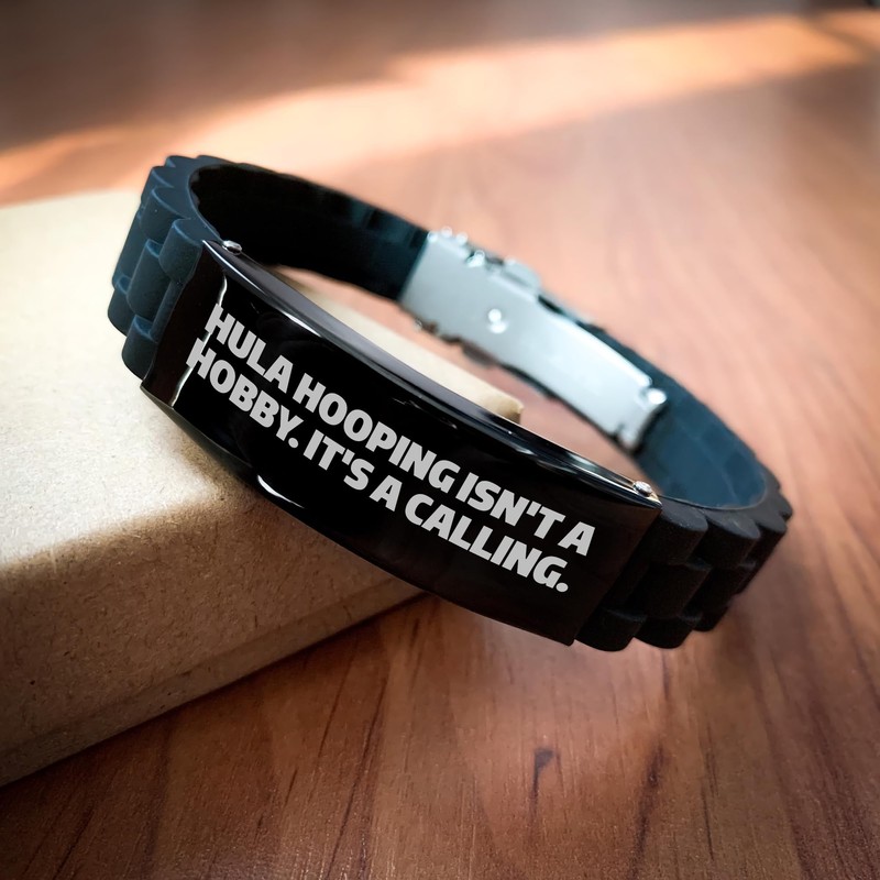Crafted from sturdy silver, black stainless steel, and silicone, this 9.05-inch bracelet is adjustable and packaged in a premium bag. The quote 'Hula Hooping Isn't A Hobby. It's A Calling.' is a funny and inspirational way to celebrate their passion for hula hooping.