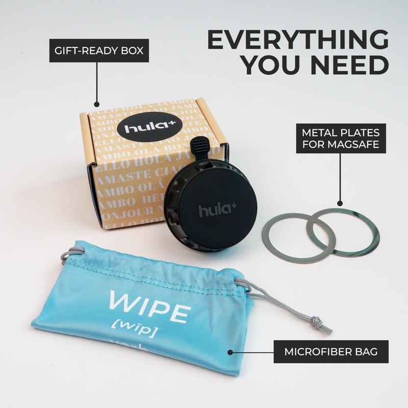 - A COMPLETE KIT: hula+ Mini comes in a giftable box with the following essential accessories; a little microfiber pouch, a metal finger holder, and 2 metallic plates.