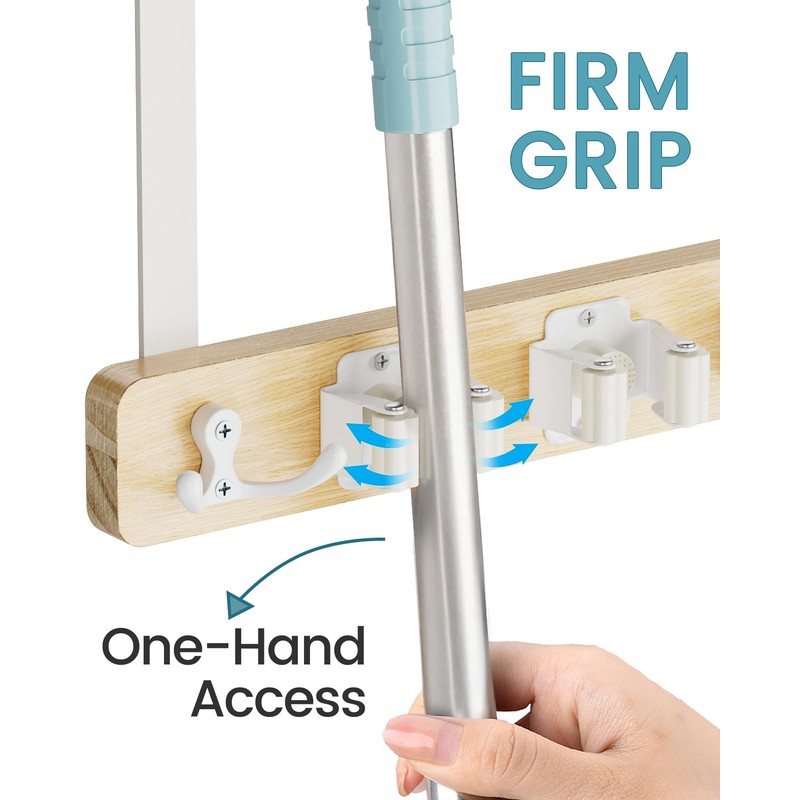 - Fits Any Room: Combining a wood-style panel with metal hardware, this over door broom and mop holder suits laundry rooms, kitchens, garages, and utility spaces. Its clean, functional look adds a warm touch to any space. A thoughtful gift for housewarmings or anyone who enjoys a tidy and well-kept home.