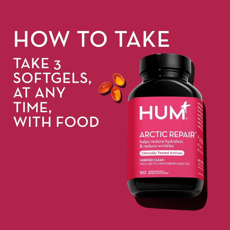 - How to Take - Take 3 lingonberry and vitamin A softgels, at any time, with food. You can pair this product with other HUM Nutrition products, when taken as directed, to enhance support for free radical damage and for skin hydration.*