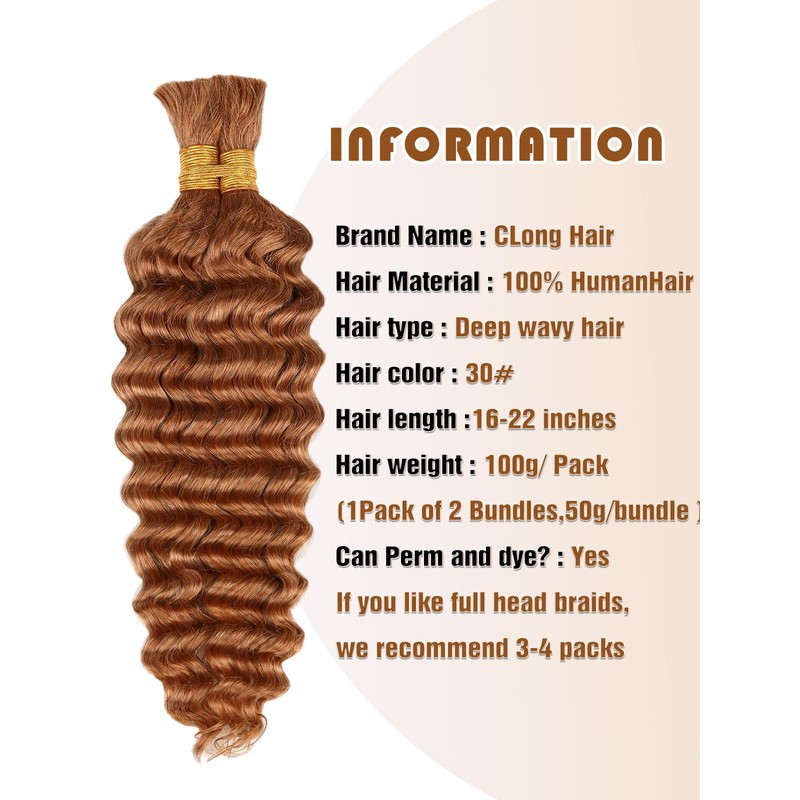Light Brown Human Braiding Hair Deep Wave Bulk,#30 Auburn No Weft Curly Braiding Hair Extensions for Boho Braids Wet and Wavy Braiding Human Hair Bundles(18inch, #30,100g)