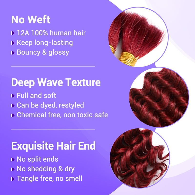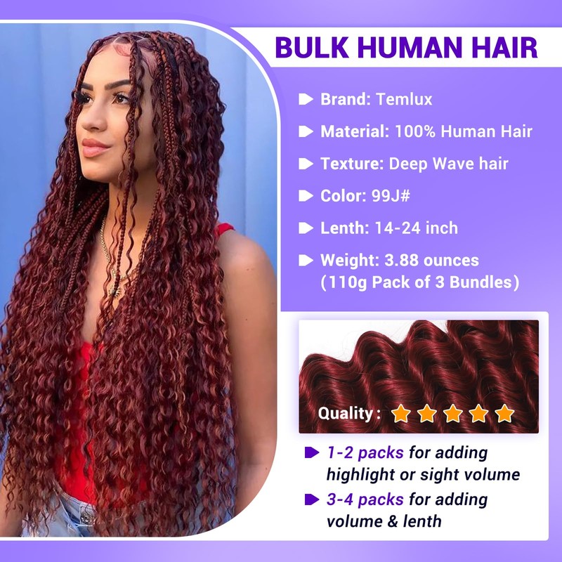 Human Braiding Hair for Boho Braids 110g 24 Inch Deep Wave Boho Bulk Human Hair for Braiding Knotless 12A Wet and Wavy Bohemian 3 No Weft Bundles/Pack Curly Braids Burgundy