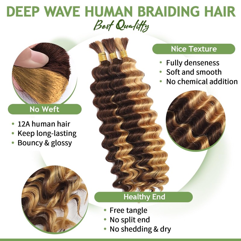 Human Braiding Hair for Boho Braids 120g 12A Deep Water Wave Bulk Human Hair Knotless Boho Braiding Curly 100% Virgin No Weft Extensions Bohemian Braids 3 Bundles/Pack Balayage 16 Inch