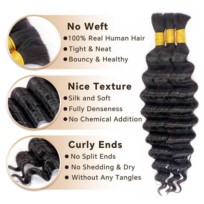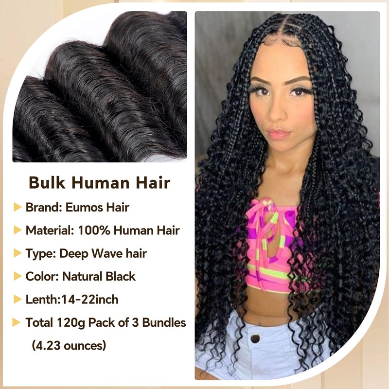- 【Suitable for any Occasion】: Our Deep Wave bulk human hair is different from the general hair extensions, There is no weft, making it incredibly versatile for various braiding styles. Such as bohemian braids, Knotless BOHO braids, Box braids, Cornrows, Twists, Curly loose wave hair styles,etc. You can also use it to add length and volume to your natural hair. Suitable for daily life, wedding, dating, graduation ceremony, vacation, parties, gifts and so on.